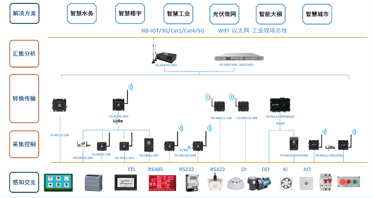 支持各类工业现场总线,支持Lora、4G、WIFI