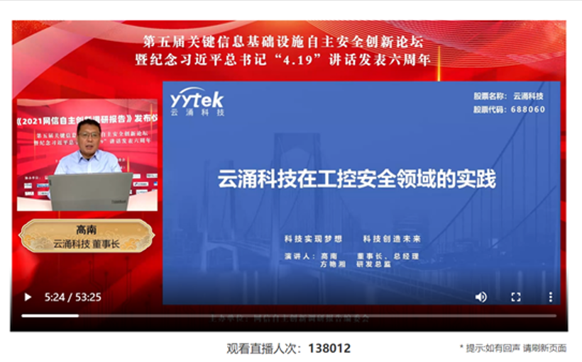 在大会企业线上专场环节,威廉希尔董事长高南和研发总监方艳湘,为大会带来了《威廉希尔在工控安全领域的实践》的精彩演讲.
