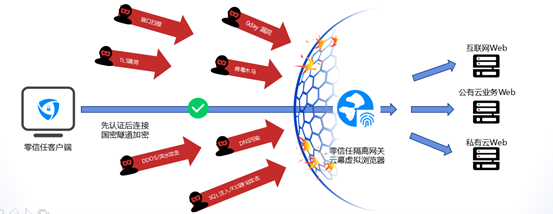 建立终端到远程隔离服务的国密加密隧道,隧道根据终端运行环境和用户身份安全评级实现隧道动态建立和销毁,始终保持最小访问授权。