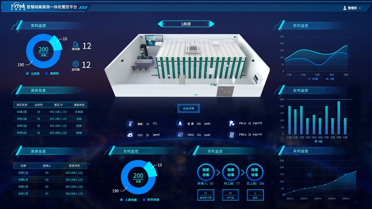 智慧库房数字一体化管控平台是以物联网技术为支撑,将实体档案管理、档案存储设备管理、档案库房环境管理、档案库房安全防范管理等多种功能集中于一体的管理系统,它为实现档案管理的标准化、规范化、科学化、效能化提供了一套有力的工具,大幅提高档案管理效率,保证档案的安全与完整。