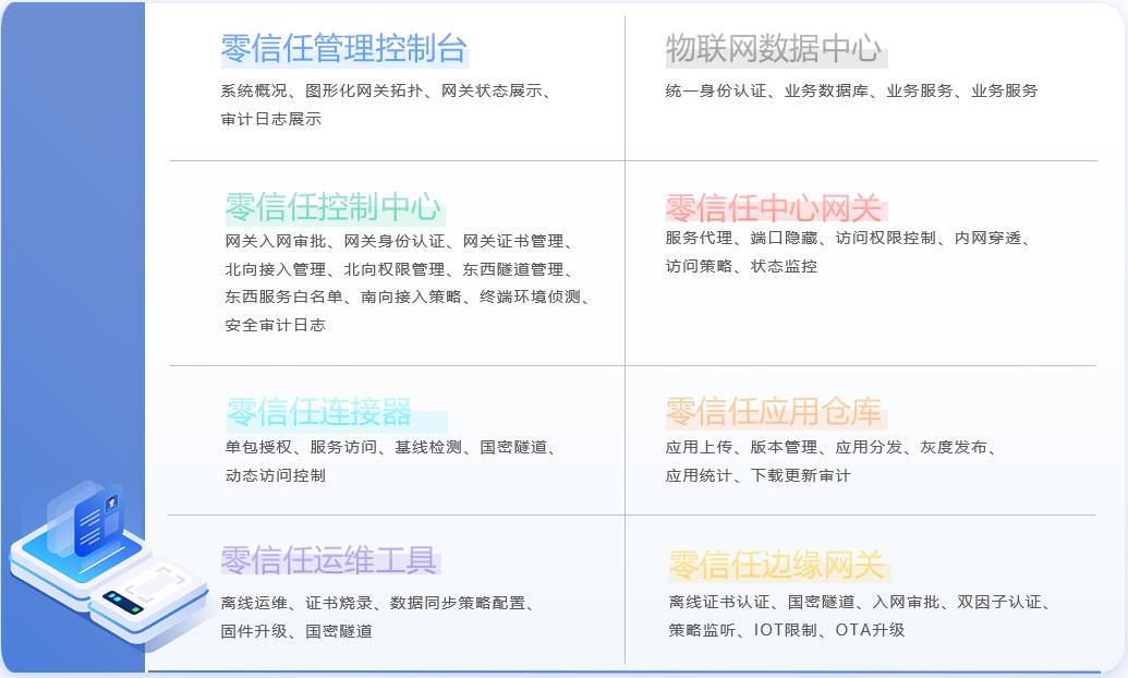 平台由边缘网关代理程序、网关离线运维工具、控制中心、接入网关、应用仓库等模块组合而成。产品核心功能包括边缘网关身份认证、网关出入站访问控制、网关间微隔离控制、边缘应用管理、网关安全运维、网关数据存储透明加解密等。同时平台保护网关与北向数据中心的访问安全,包括端口隐藏,通讯加密等。