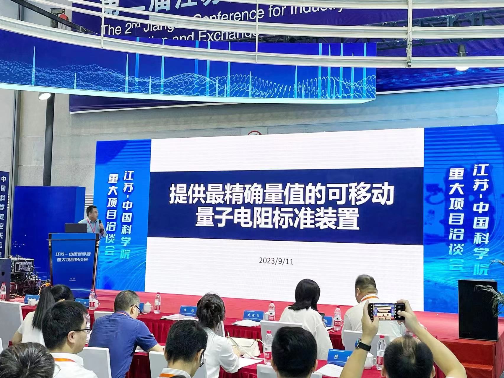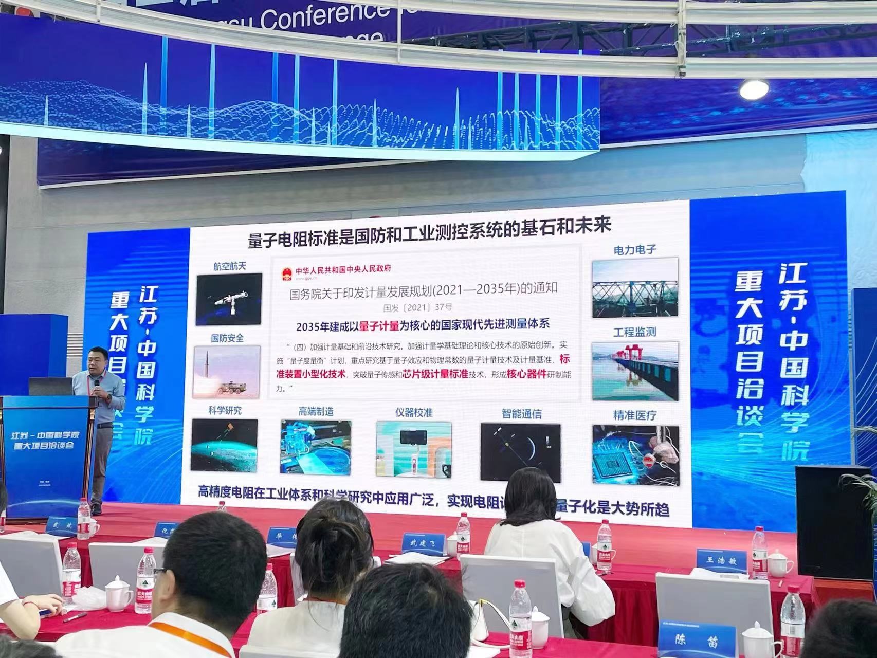 在江苏——中国科学院重大项目洽谈会的路演中,王浩敏研究员发表了题为《提供最精确量值的可移动量子电阻标准装置》的演讲,他表示量子电阻标准支撑了整个科学和工业测量参比体系,在电子信息、航空航天、医疗以及国防等领域有着广泛的用途。量子电阻是可以直接测量且只与自然常数相关的宏观电学物理量。目前,中、美、日等国家级计量实验室均建成了量子霍尔电阻标准装置(QHRS),并在进行推广,我国也正在开展针对用于新一代量子电阻的芯片技术研发。QHRS的研制将带来电学测量原理、方法和仪器形态的全面创新,并形成独特的材料与设备产业,从而对信息产业结构产生巨大影响。