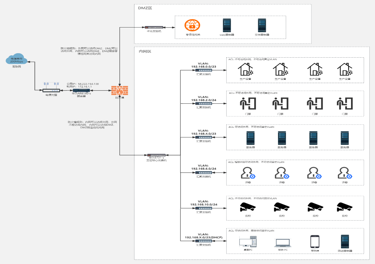其次,为了解决内网安全隐患,根据业务类型和部门划分不同的VLAN,各VLAN之间的通过ACL策略进行合理的访问控制。同时建立DMZ区,DMZ区用来放置必须公开的服务器资源(如企业Web服务器、文件服务器、论坛等)和零信任网关,外网、DMZ和内网之间通过防火墙进行隔离。