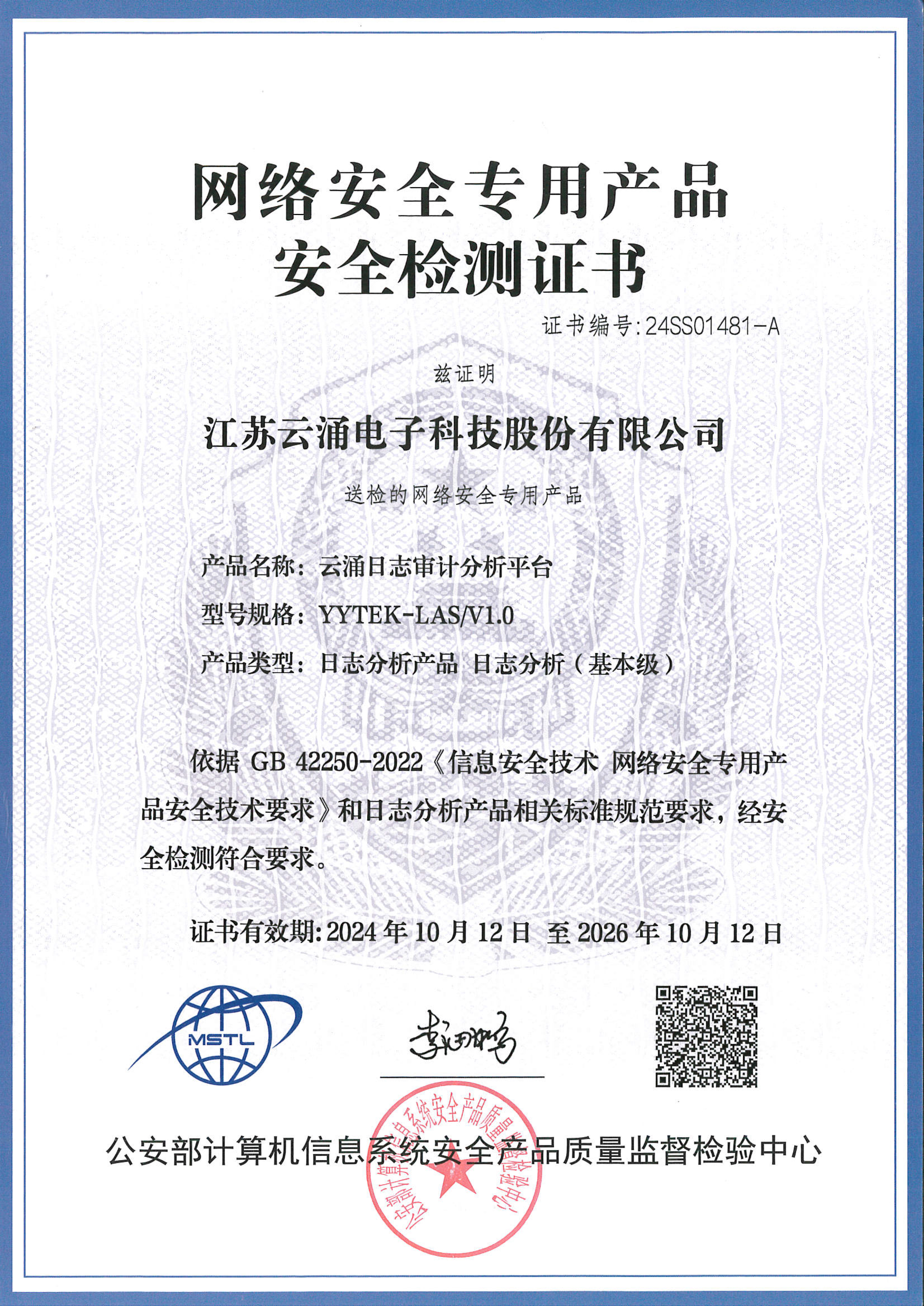 近日,威廉希尔日志审计分析平台顺利通过公安部权威检测机构的严格安全检测,成功获得《网络安全专用产品安全检测证书》,标志着日审平台在产品功能性、兼容性、安全性、稳定性等多个方面均满足检测标准,性能和质量达到先进水平,是满足强制性国家标准的网络安全专用产品。这一成果意义重大,它不仅是公司产品合规的有力证明,还极大提升了威廉希尔的品牌形象,增强了市场竞争力。