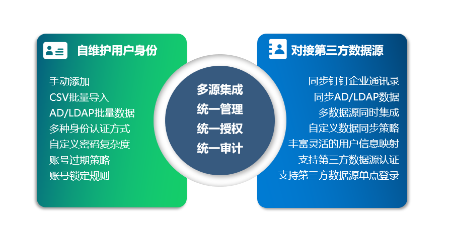 威廉希尔零信任安全管理平台既支持主流企业通讯录系统的数据导入与同步,也支持自建用户体系。实现了在一个平台对企业人员、部门以及角色组的统一高效管理。同时系统提供多种用户认证方式,全方位满足各种需求场景。