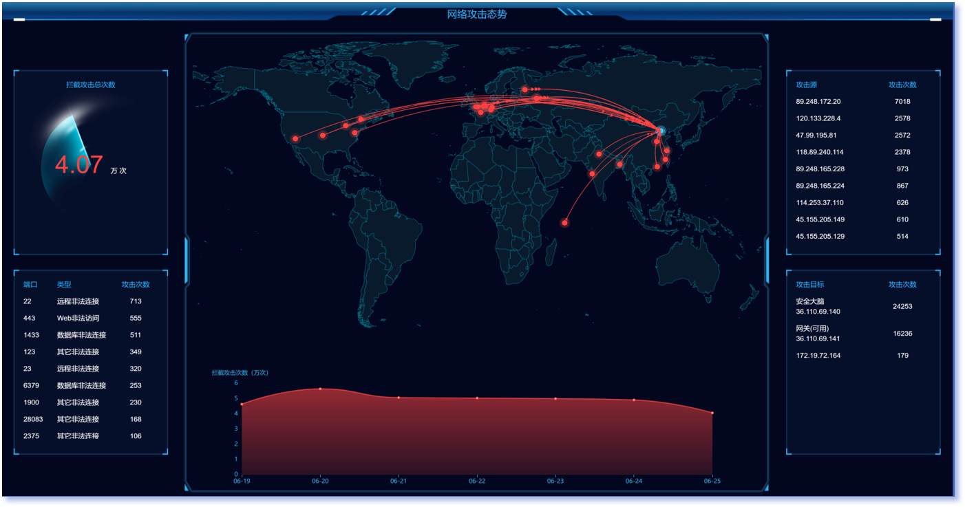 ♦威廉希尔提供了基于零信任系统的网络攻击态势感知,管理端大屏展示从攻击源到攻击目标的实时态势;