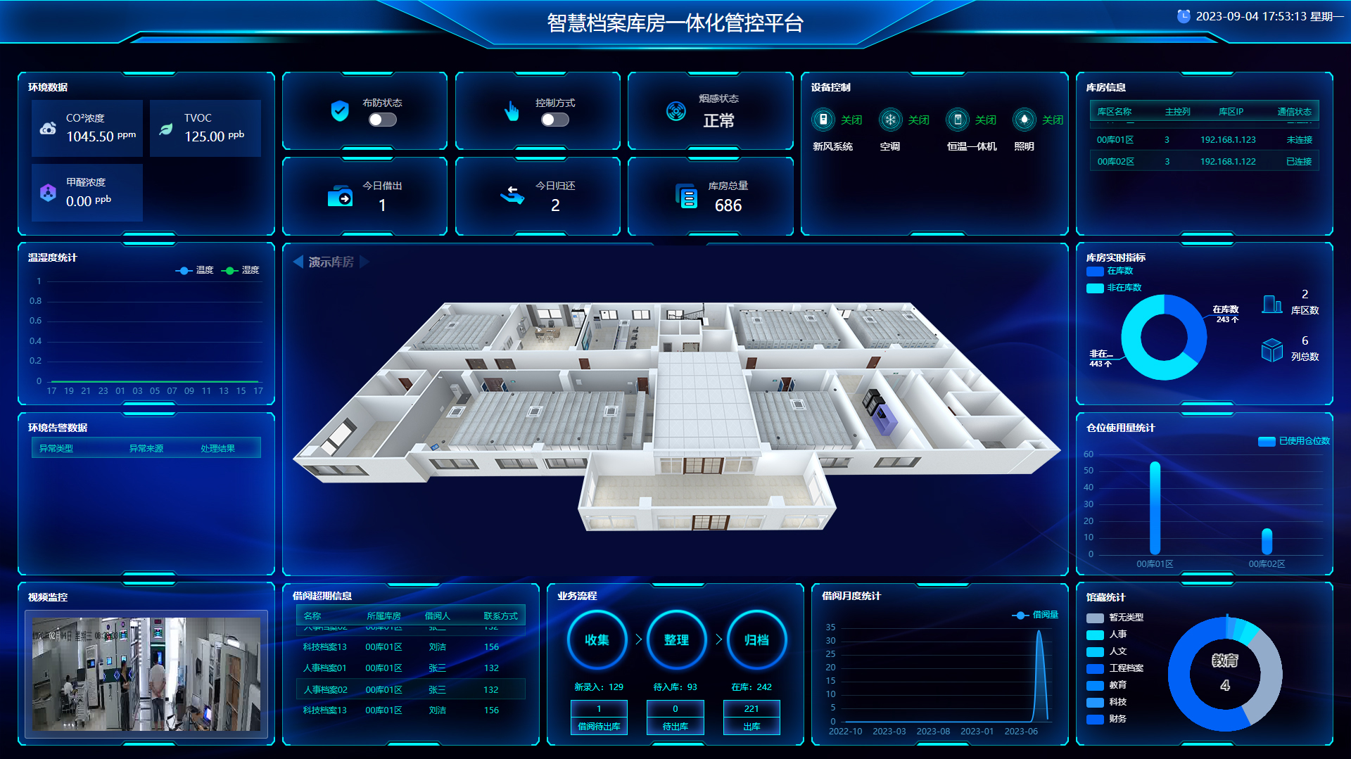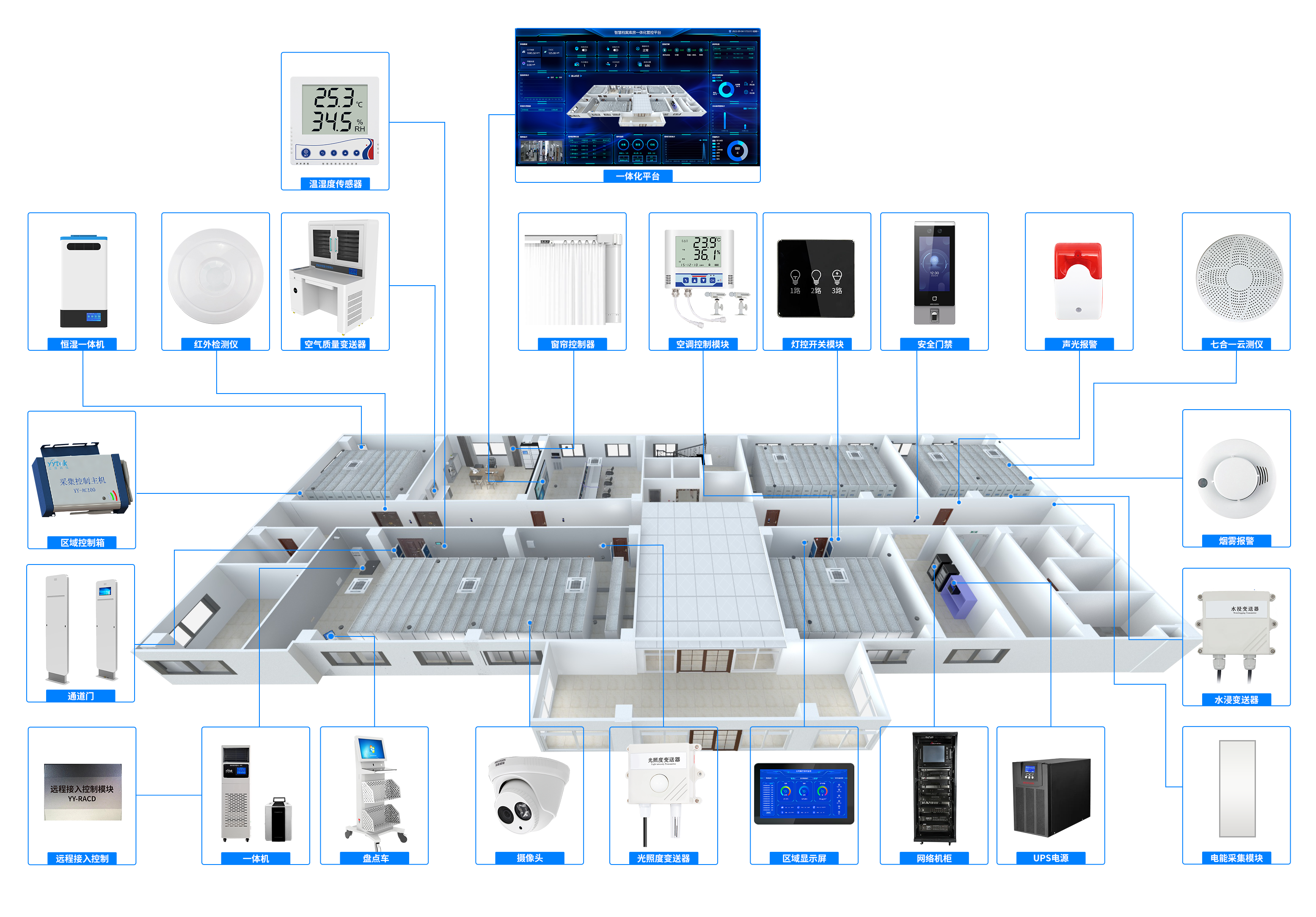通过一套系统实现库房内实体档案管理设备、档案存储设备、档案库房环境监控设备、档案库房安全防范设备等的统一管理。