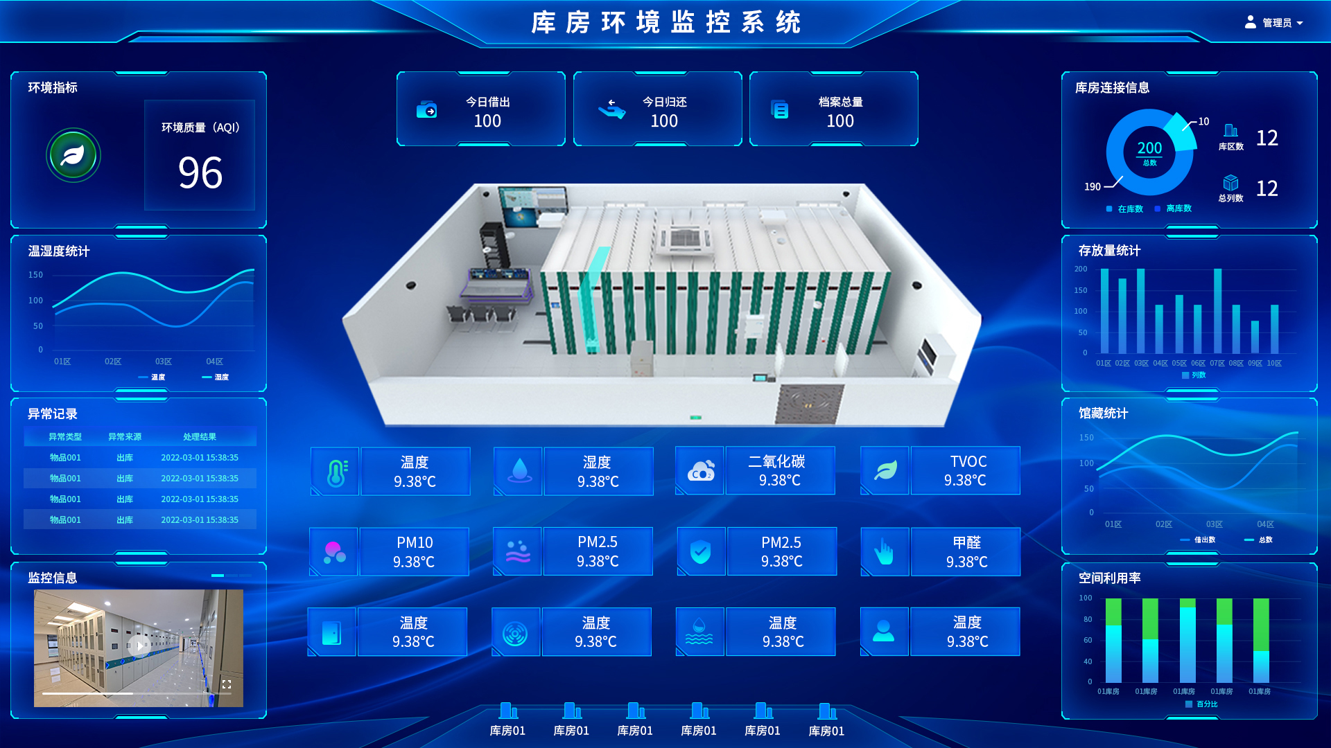 系统配置视频监控、红外探测器、门禁管理设备,通过系统统一管理调度,可与系统其他设备联动运行,保障库房安全,同时对库房内的空气质量状况进行了有效的监测、控制以及治理,自动调节、过滤、净化,时刻保证库房内空气质量的健康、稳定